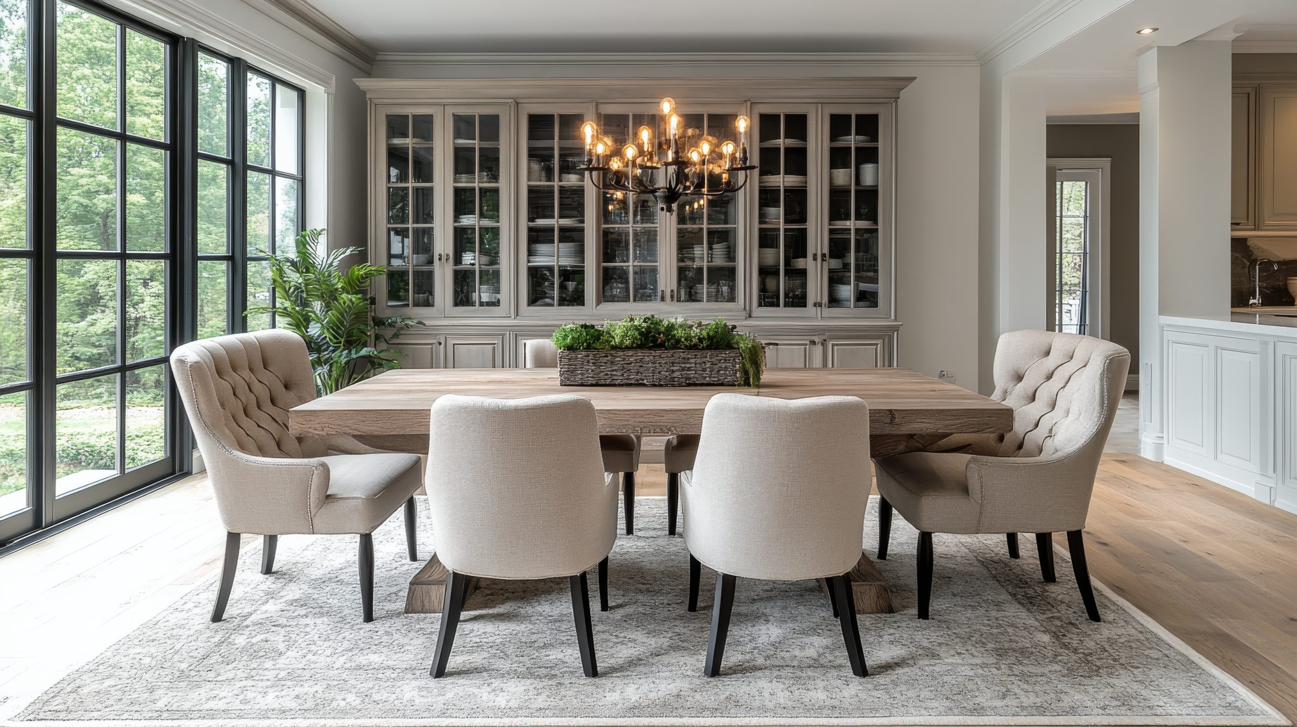 elegant dining area with wooden table and comfortable chairs in a cozy cabin setting